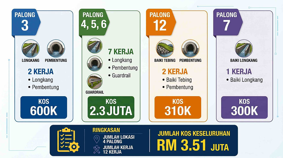 Kerja-kerja pembaikan infrastruktur dijalankan di beberapa lokasi Felda Palong melibatkan: